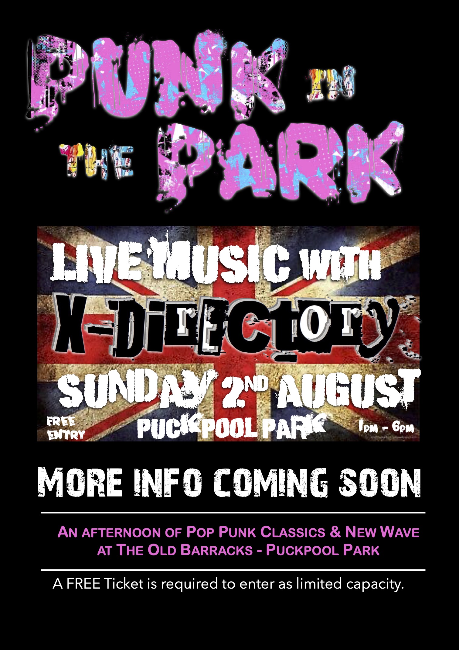 Punk in the Park is an afternoon of Pop Punk and New Wave music with live band ‘X-Directory’ at Puckpool Park.